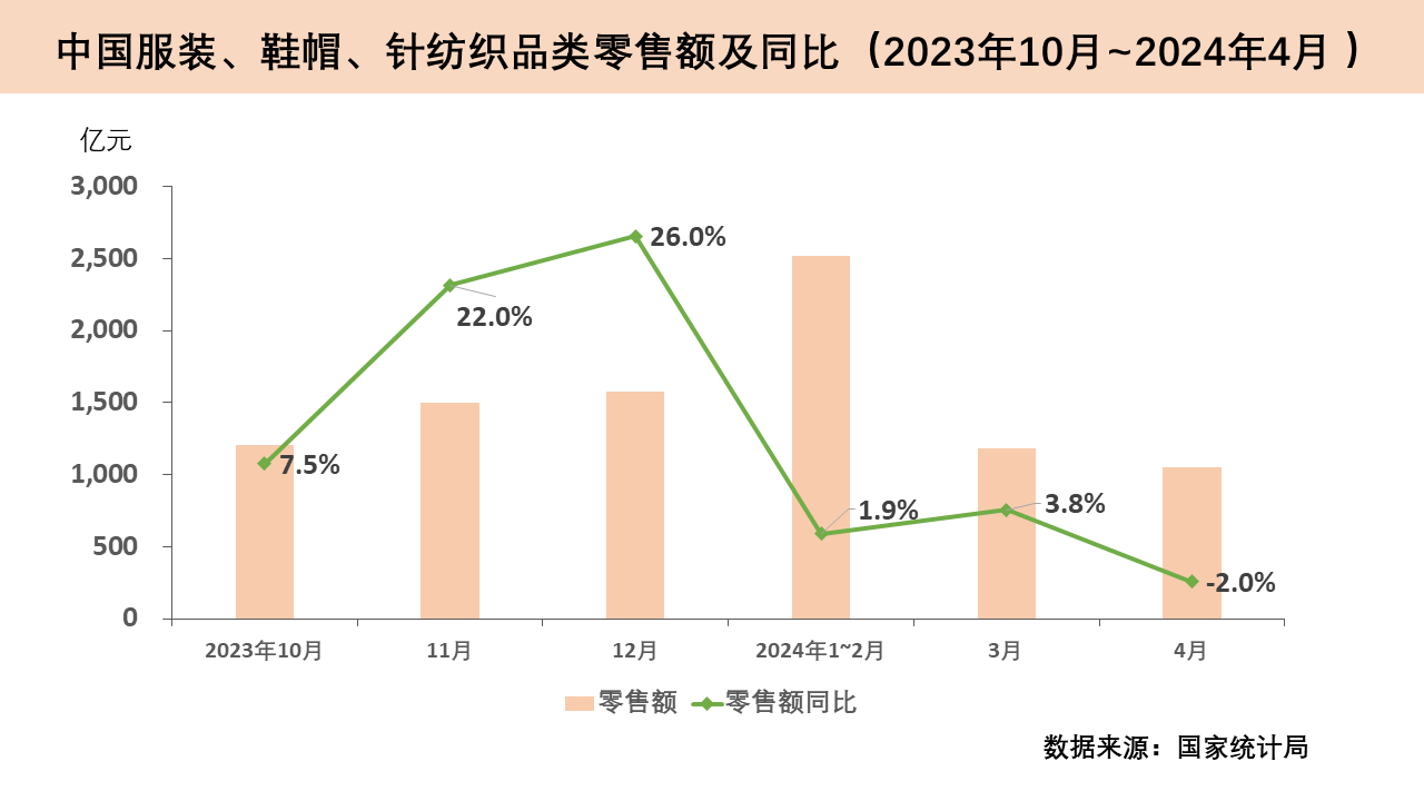 我國內需平穩(wěn)增長。2024年一季度,我國GDP同比增長5.3%,社會消費品零售總額同比增長4.7%,經濟運行延續(xù)回升向好態(tài)勢。服裝零售潛力穩(wěn)步釋放,紡織品服裝消費實現(xiàn)平穩(wěn)增長。1至4月,我國限額以上單位服裝鞋帽、針紡織品類商品零售額達4717億元,同比增長1.5%,但4月當月限額以上單位服裝類商品零售額同比下降2%。直播帶貨等電商新模式對線上消費增長的拉動作用明顯,1至4月全國網上穿類商品零售額同比增長10.5%,增速較上年同期放緩3個百分點。