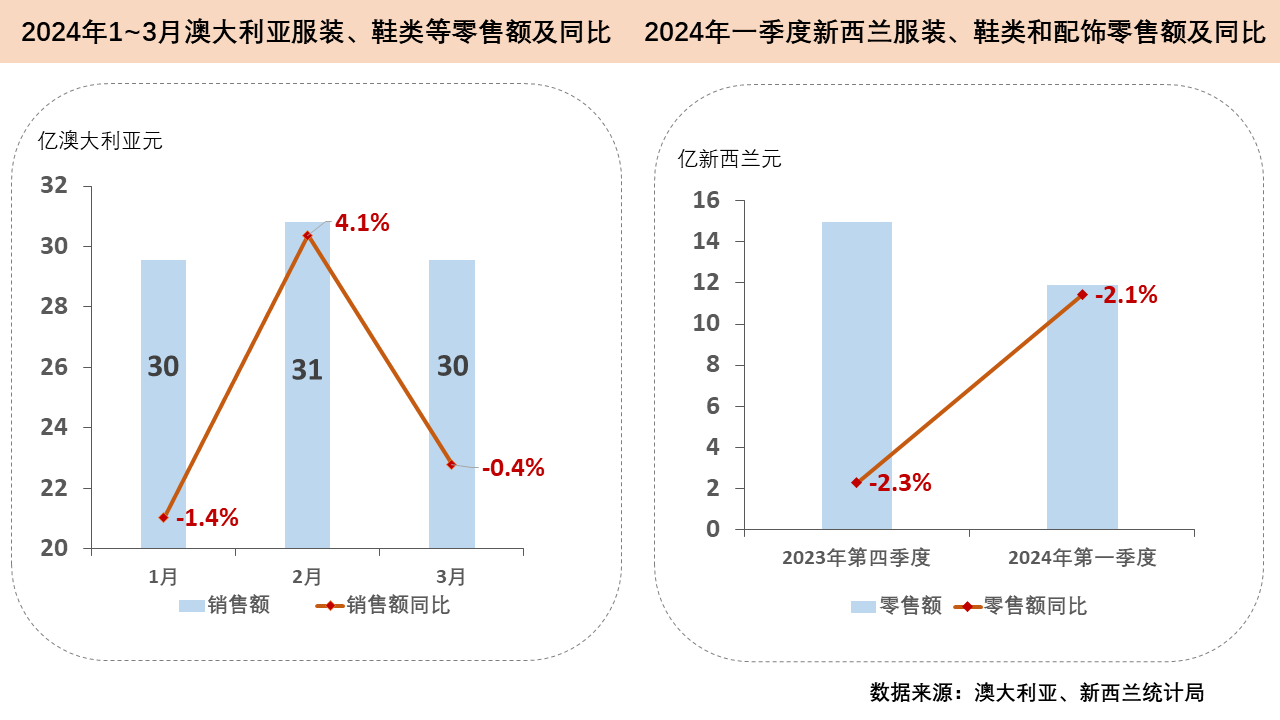 新西蘭市場尚未恢復。根據(jù)新西蘭統(tǒng)計局數(shù)據(jù)顯示,今年一季度新西蘭通脹率由去年第四季度的4.7%降至4%,為近三年來最低水平,但高物價水平對消費的抑制作用仍未消散。同期,新西蘭服裝、鞋類和配飾零售額為11.9億新西蘭元(約7.3億美元),同比減少2.1%。