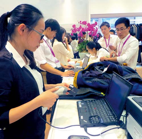 2、在江陰龍陽紡織有限公司展位,記者看到,觀眾紛紛拿著自己心儀的面料排隊交給工作人員。原來,龍陽紡織的每一款參展面料都設(shè)有二維碼,觀眾只要將看中的面料交給工作人員掃描,同時錄入買家地址,公司總部就會即時得到相關(guān)信息并組織發(fā)樣品,效率大大提高。