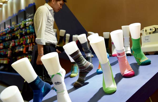 7、一家企業(yè)展出的戶外功能性襪子。這里的每一雙襪子都具備最佳舒適性以及透氣快干、超強耐磨、抗菌除臭的功能。