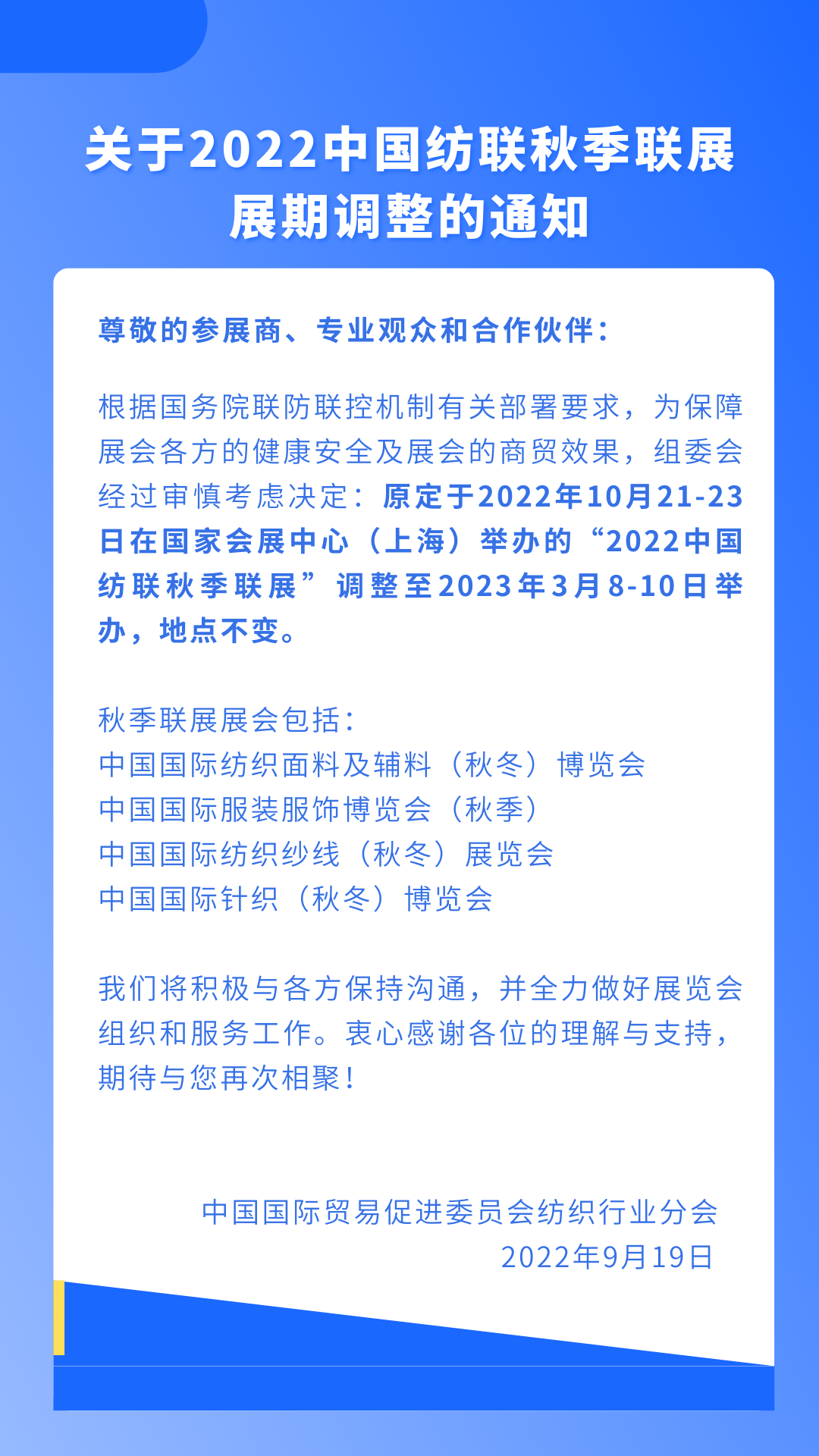 您現(xiàn)在的位置是:首頁(yè) > 新聞?lì)^條 關(guān)于2022中國(guó)紡聯(lián)秋季聯(lián)展展期調(diào)整的通知 來(lái)源:紡織貿(mào)促會(huì) 發(fā)布日期:2022-09-19 字體: 【小】 【中】 【大】 分享: 熱門文章: 2025intertextile春夏 | “友禮”同享齊觀展... [2025-02-19] 2024年我國(guó)紡織行業(yè)經(jīng)濟(jì)運(yùn)行總體平穩(wěn) [2025-02-17] 聚焦綠色智慧融合 展示產(chǎn)業(yè)用紡織品新趨勢(shì) [2025-02-11] 響應(yīng)政策 落實(shí)服務(wù) | PH Value義烏展全力“備戰(zhàn)”中 [2025-02-11] 【亮星季】第一期正式開(kāi)啟 | 商貿(mào)先行,品質(zhì)好禮享不停 [2025-02-10] 展會(huì)直通車
