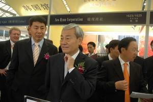 在中國貿(mào)促會紡織分會副會長富榮沛陪(左二)同下參觀博覽會
