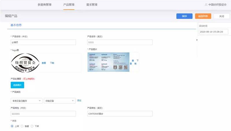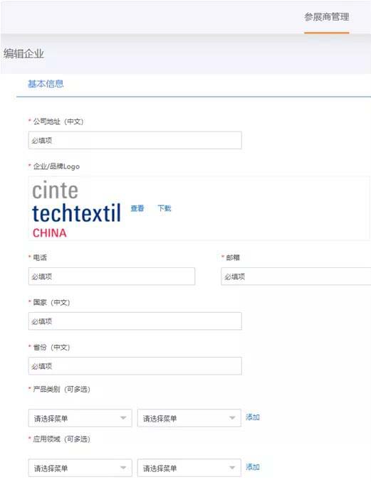 點(diǎn)擊“參展商管理”填寫企業(yè)信息,企業(yè)logo點(diǎn)擊可更換,產(chǎn)品類別、應(yīng)用領(lǐng)域、展商類別可多選、中英公司簡(jiǎn)介、產(chǎn)品簡(jiǎn)介,限150字,超出內(nèi)容無(wú)法顯示;