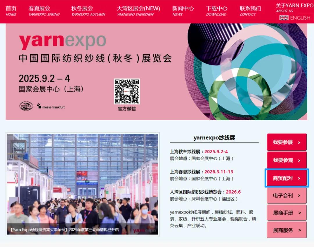 只要您有采購纖維紗線產(chǎn)品意向,希望快速找到心儀的產(chǎn)品,便可通過主辦方【商貿(mào)配對】預(yù)約服務(wù)系統(tǒng)進(jìn)行申請。