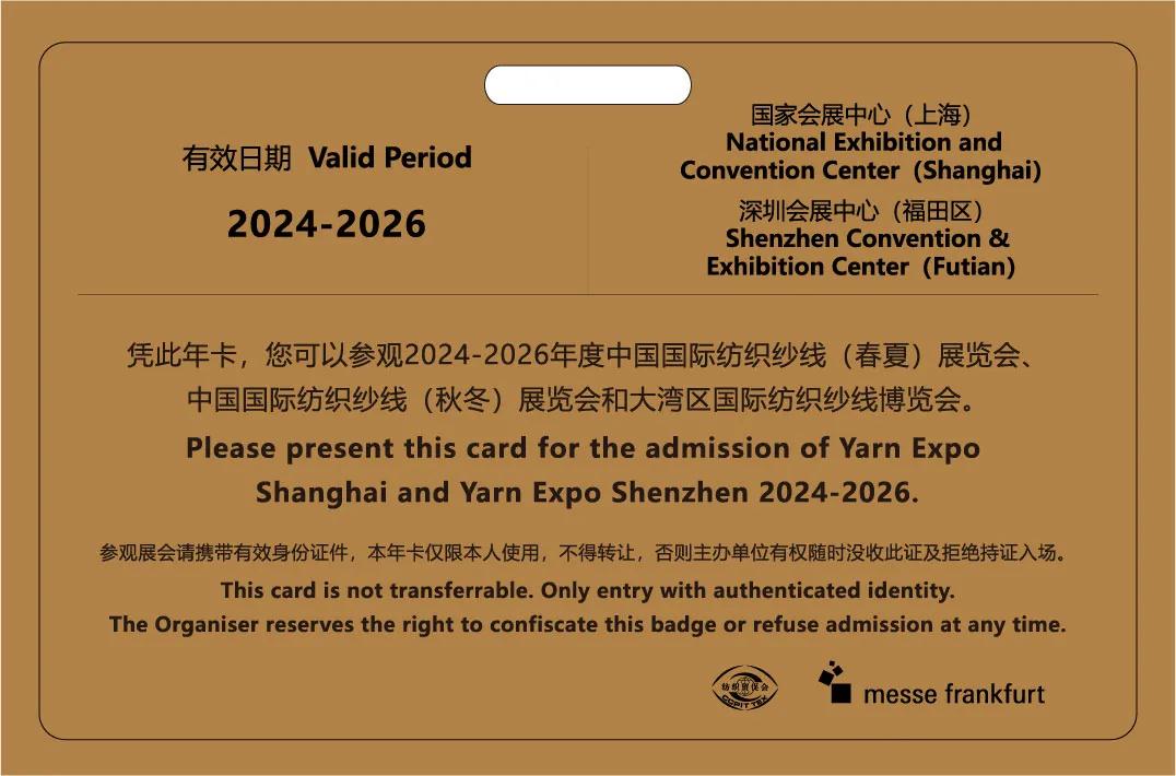 Yarn Expo紗線展貴賓買家年卡是Yarn Expo紗線展組委會(huì)為專業(yè)觀眾提供的特別服務(wù)。貴賓買家年卡三年為一個(gè)有效周期,本周期即在2024至2026年三年內(nèi),持卡觀眾可憑此卡參觀2024-2026年度中國國際紡織紗線(春夏)展覽會(huì)、大灣區(qū)國際紡織紗線博覽會(huì)、中國國際紡織紗線(秋冬)展覽會(huì),并享受主辦方為您提供的系列專屬服務(wù)。