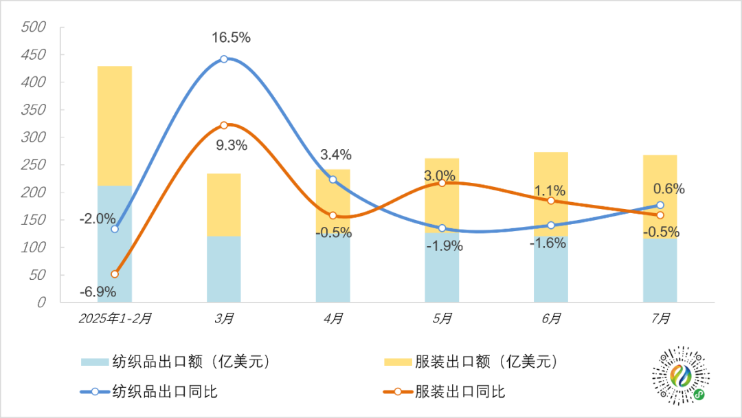 圖1 2025年1~7月全國(guó)紡織品、服裝出口月度統(tǒng)計(jì)
