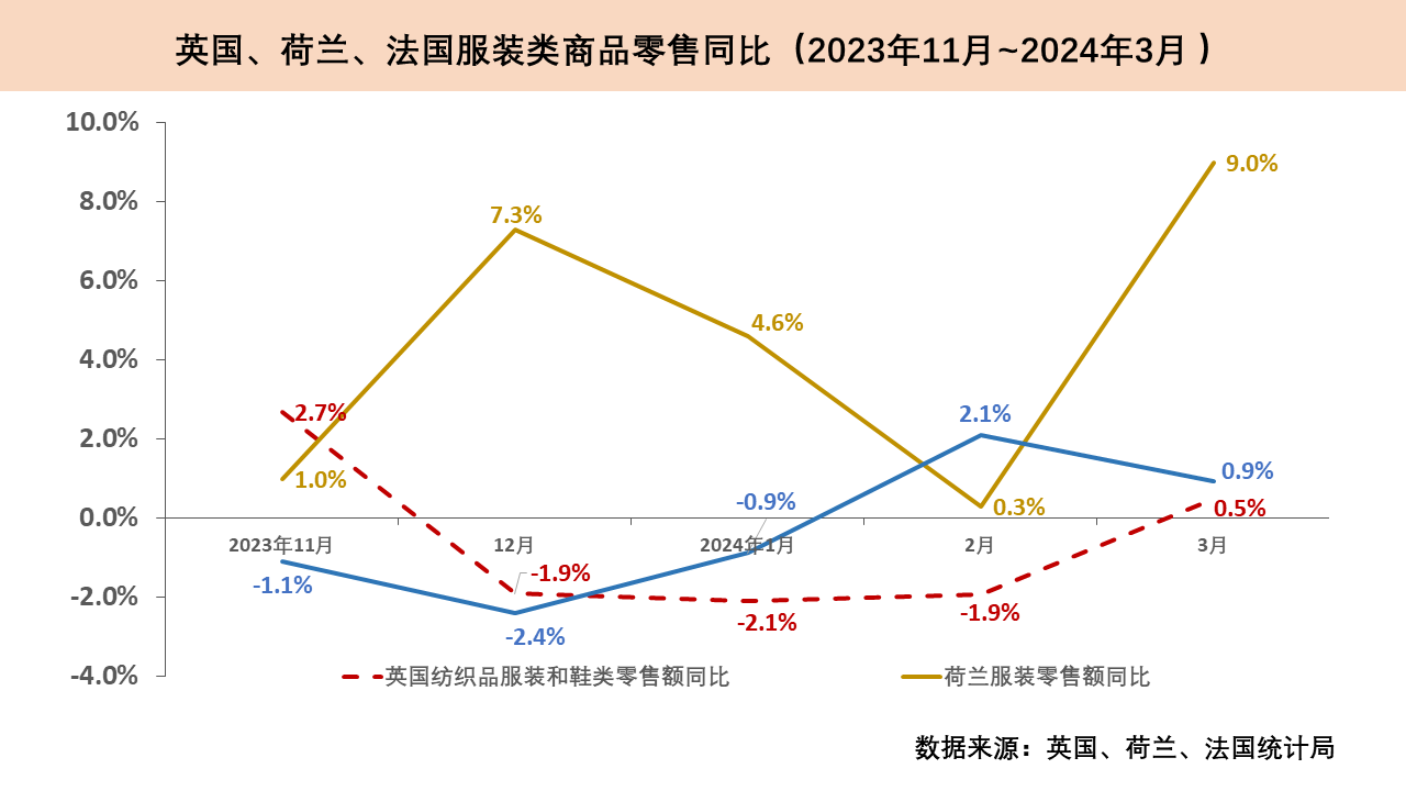 荷蘭服裝零售保持正增。2024年一季度,荷蘭GDP同比下降0.1%,與上個季度相比,增速由正轉負。同期,荷蘭服裝零售額基本保持穩(wěn)定增長,前三個月同比增速分別為4.6%、0.3%和9%,推動了整體零售額的上升。