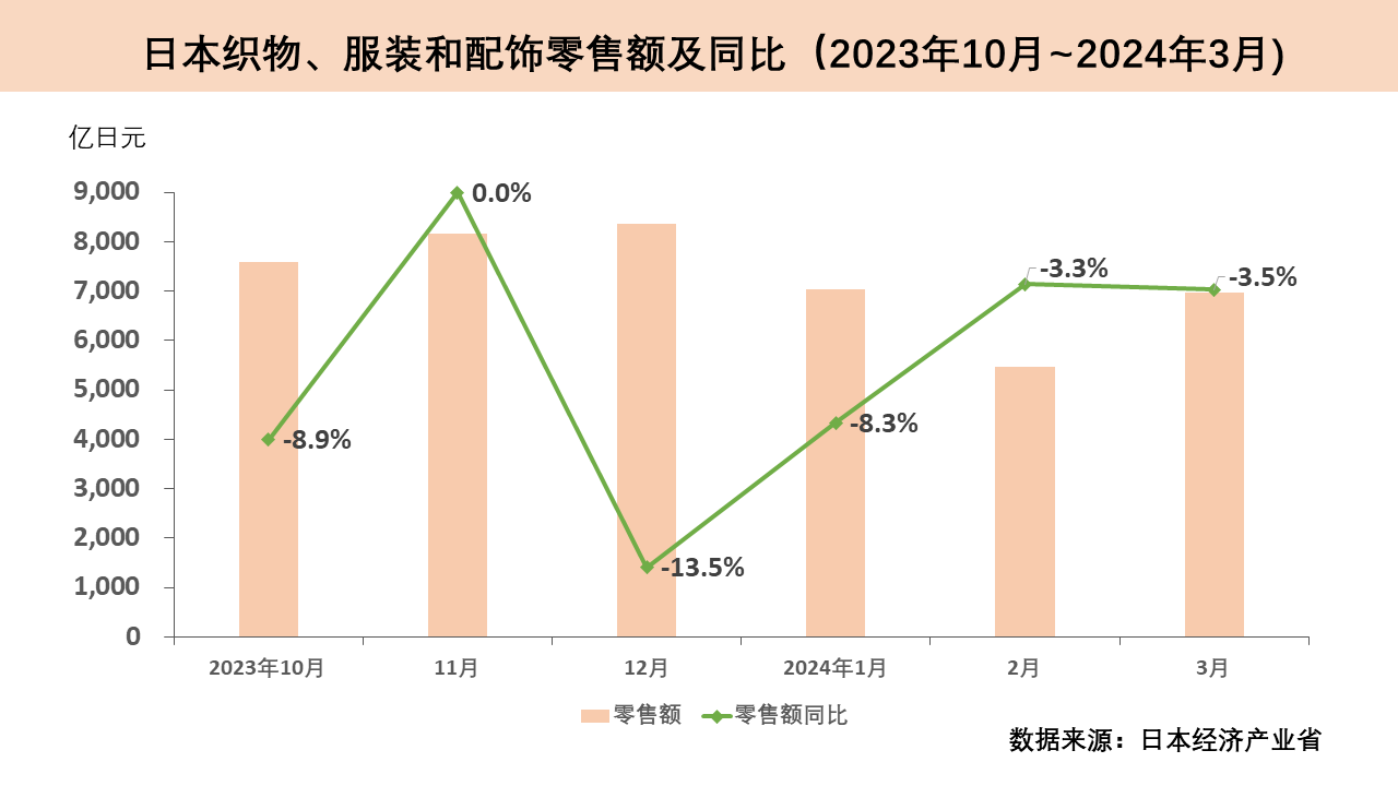 今年一季度,日本織物、服裝和配飾零售額達19480億日元(約124.3億美元),同比減少5.2%。其中,1月服裝相關零售額同比下降8.3%;2月同比減少3.3%,環(huán)比大幅下降22.2%;3月同比減少3.5%,環(huán)比增長27.6%。